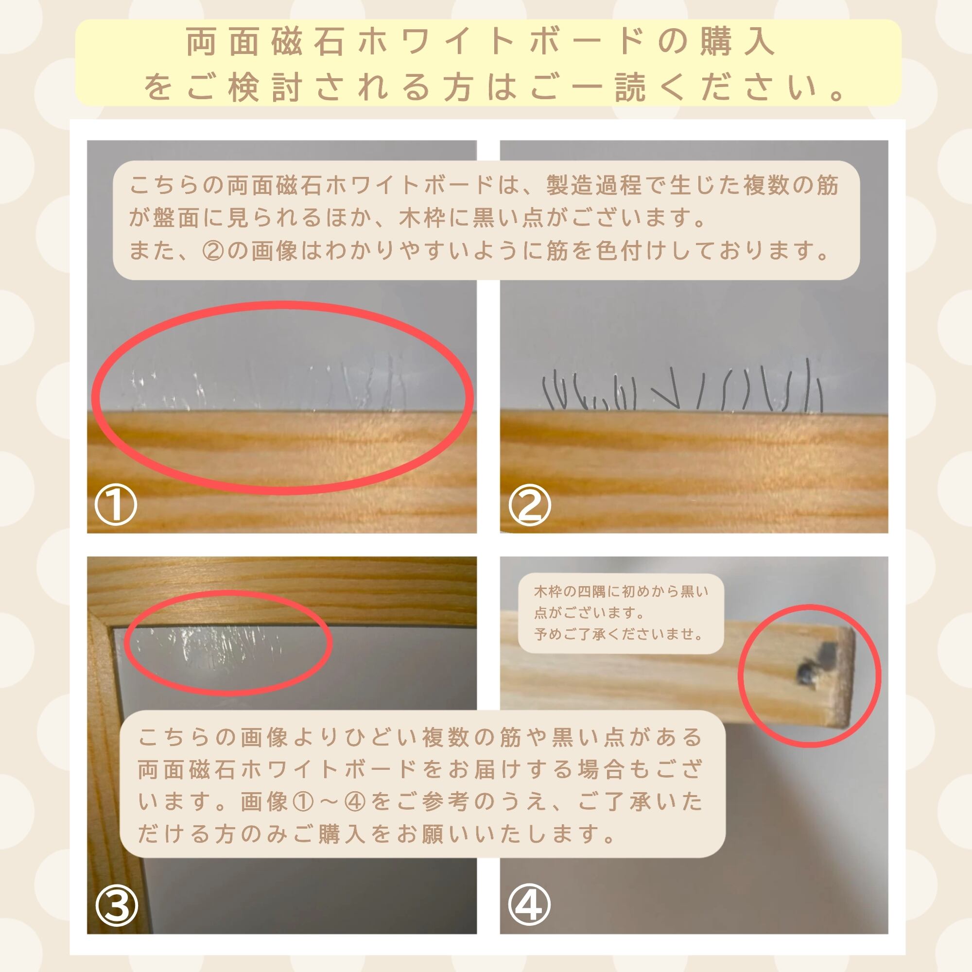こちらのホワイトボードは、製造過程で生じた複数の筋が盤面に見られるほか、木枠に黒い点がございます。